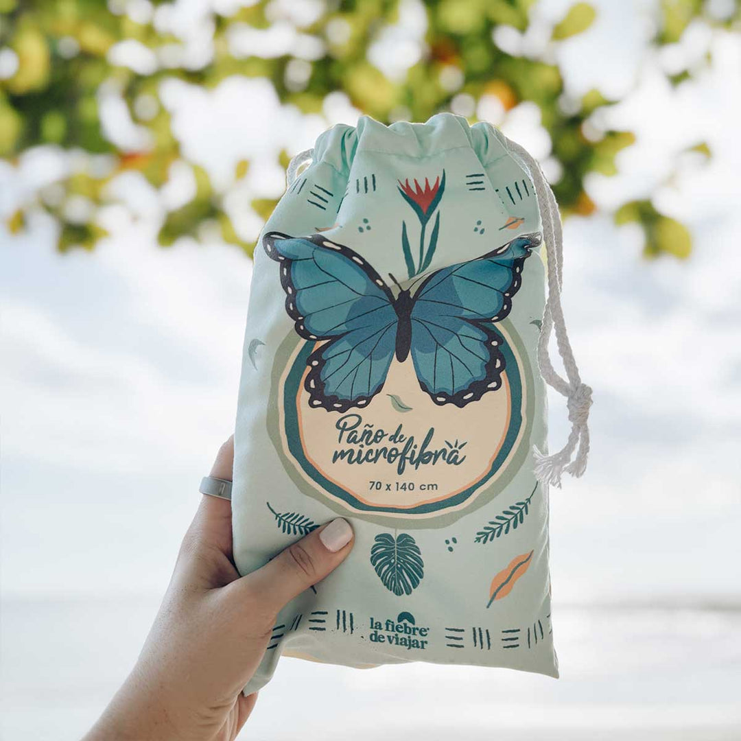 Bolsita de microfibra, sus medidas son 17 x 28 cm, con una tirita para que la transportés fácilmente.